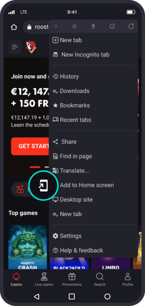Go to the Rooster Bet homepage and tap three dots to open the browser menu.